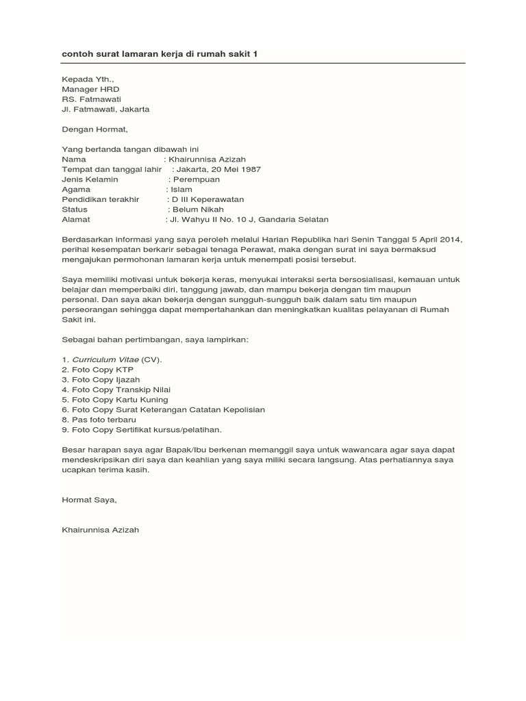 Surat lamaran kerja adalah surat yang diajukan oleh pelamar kerja kepada instansi atau perusahaan tujuan pekerjaan contoh surat lamaran kerja rumah sakit. Anda bisa menulis contoh surat lamaran kerja dalam bahasa inggris untuk melamar pekerjaan.